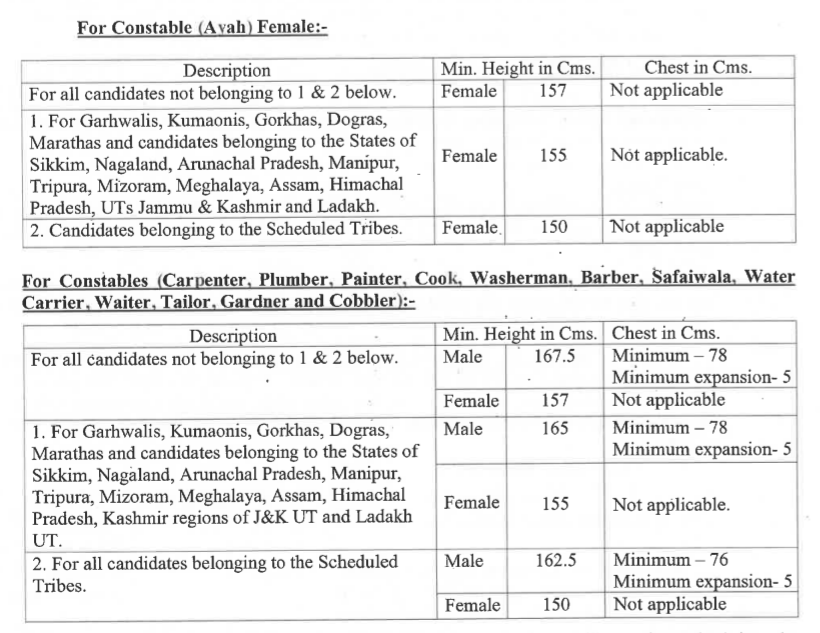 | Constable (Driver, Laboratory Assistant,Veterinary,Carpenter, Plumber & Painter,Tailer, Cobbler, Gardener, Cook, Washerman, Barber, Safaiwala, Water Carrier & Waiter) | 4.8km Race in 24 Minutes | 2.4km Race in 18 Minutes |